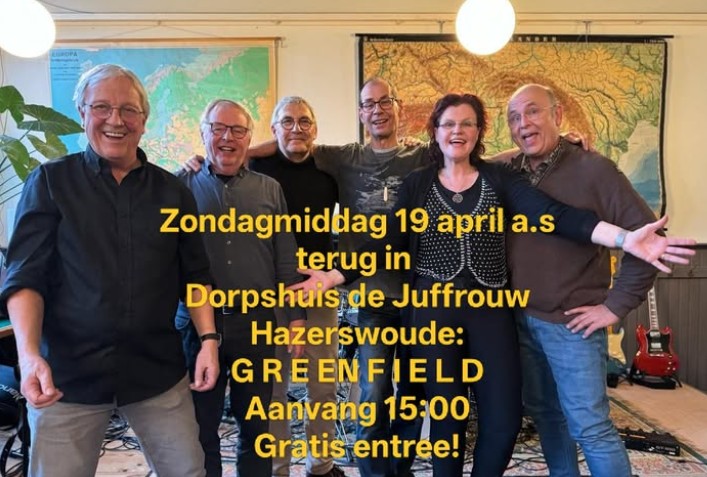 Zes ervaren muzikanten, met hun roots in het Groene Hart en de Bollenstreek komen samen in de band Greenfield. De band maakt muziek in de sfeer van The Common Linnets, The Little River Band, Venice, Ilse de Lange, Paul Carrack, The Eagles en vele anderen. Wat opvalt is de meerstemmige zang, de smaakvolle begeleiding en het speelplezier van de bandleden. Dat zie je en dat hoor je!